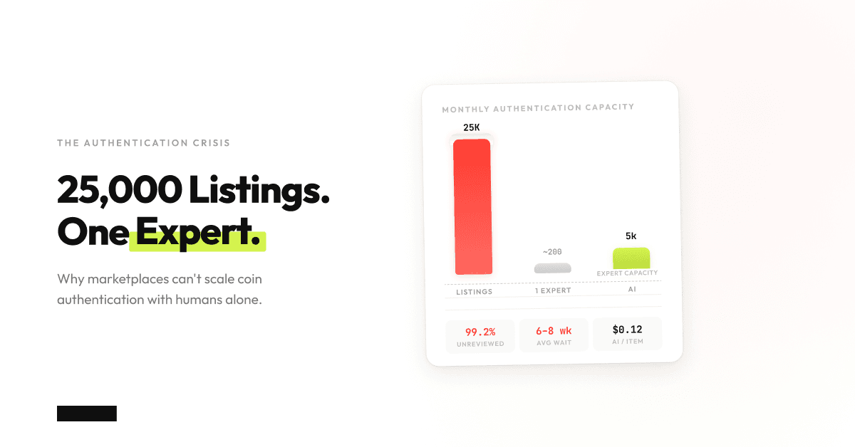 Your marketplace coin authentication team is underwater, and hiring more experts won't fix it.